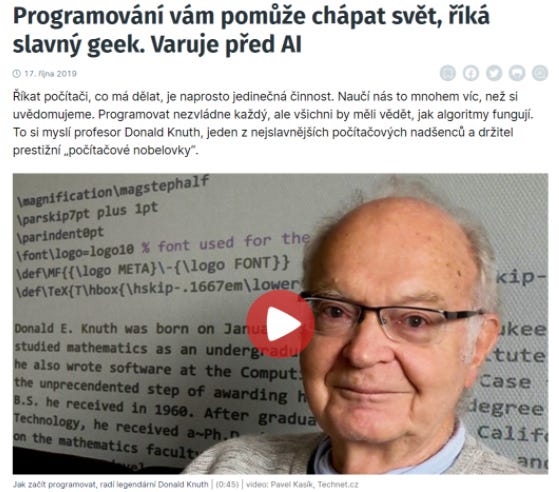 Myslím, že některé z mých nejčtenějších článků vůbec byly rozhovory. Třeba ten se sociologem Zygmuntem Baumanem, to jsme se s ním a s kolegou Matoušem Lázňovským jen posadili v kavárně, nahodili jsme tři témata, pan Bauman se rozpovídal… a co řekl, to jsme mohli v podstatě bez úprav rovnou tisknout. Ve svých 90 letech mluvil třeba o nebezpečí návykovosti sociálních sítí zasvěceněji a otevřeněji, než bylo v té době zvykem. Jsem strašně rád, že jsme to tehdy zachytili a zprostředkovali. Nebo když jsem jel v roce 2019 dělat rozhovor s otcem informatiky Donaldem Knuthem, to jsem ani nemohl věřit svému štěstí, že se mi povedlo přesvědčit ho k tak dlouhému povídání. V duchu jsem si přitom děkoval, že jsem si dal dost času na přípravu. Je to jeden z těch rozhovorů, které jsme vydali i anglicky.